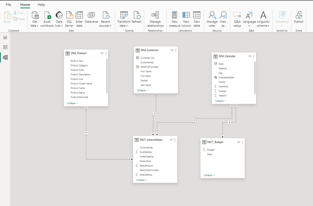 This data model also shows how FACT_Budget hsa been connected to FACT_InternetSales and other necessary DIM tables.